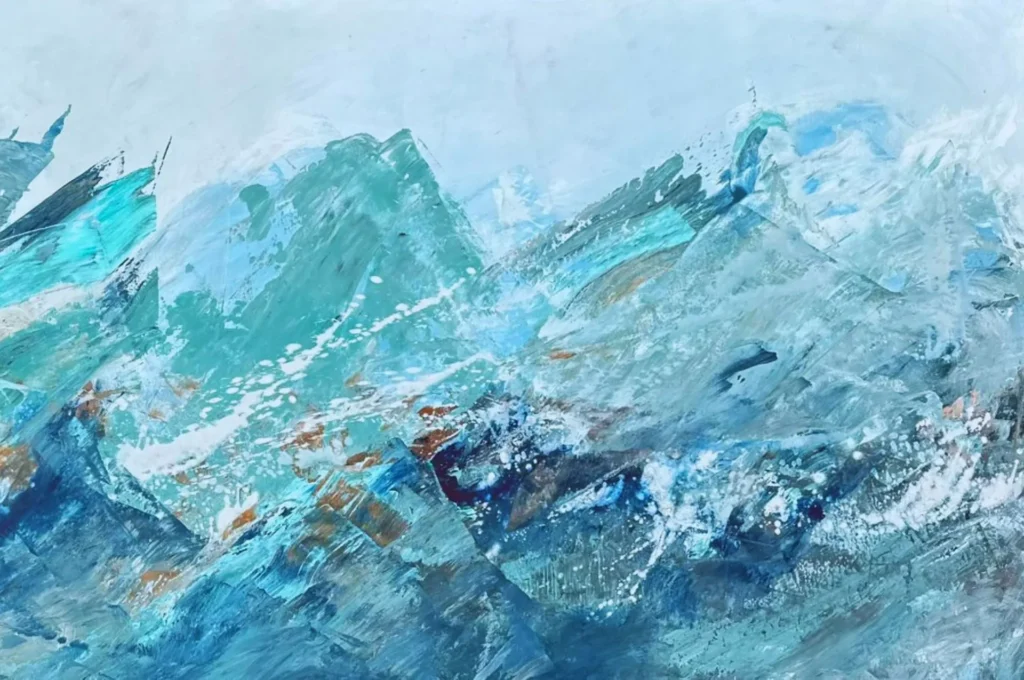 A grande tela horizontal fecha a série com uma amplitude que é quase geográfica. Planos angulares de azul, turquesa e branco evocam estratos geológicos ou montanhas de gelo — uma paisagem que se formou por pressão, por tempo, por acúmulo. O cobre e a terra que surgem nos interstícios não são interrupções: são a memória do que estava antes do azul, aquilo que ele cobre sem apagar.