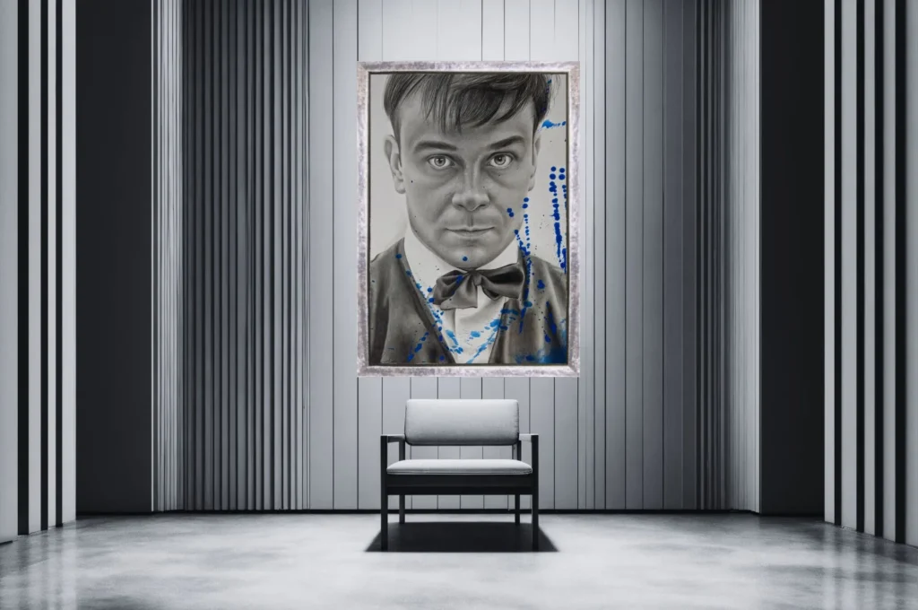 Lucas Ferreira pintou o homem que dedicou a vida a recusar a imagem. Yves Klein passou a vida recusando o objeto, o rosto, a figura — para ele, a arte era imaterial, era vazio, era azul puro sem forma que o contivesse. Nunca fez retratos. Nunca usou grafite. Dizia que o azul não tinha dimensões, que estava além de qualquer coisa que um lápis pudesse tocar.